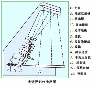 棱鏡攝譜儀主要由照明系統、準光系統、色散系統(棱鏡)及投影系統(暗箱)四部分組成,如圖7-4所示。